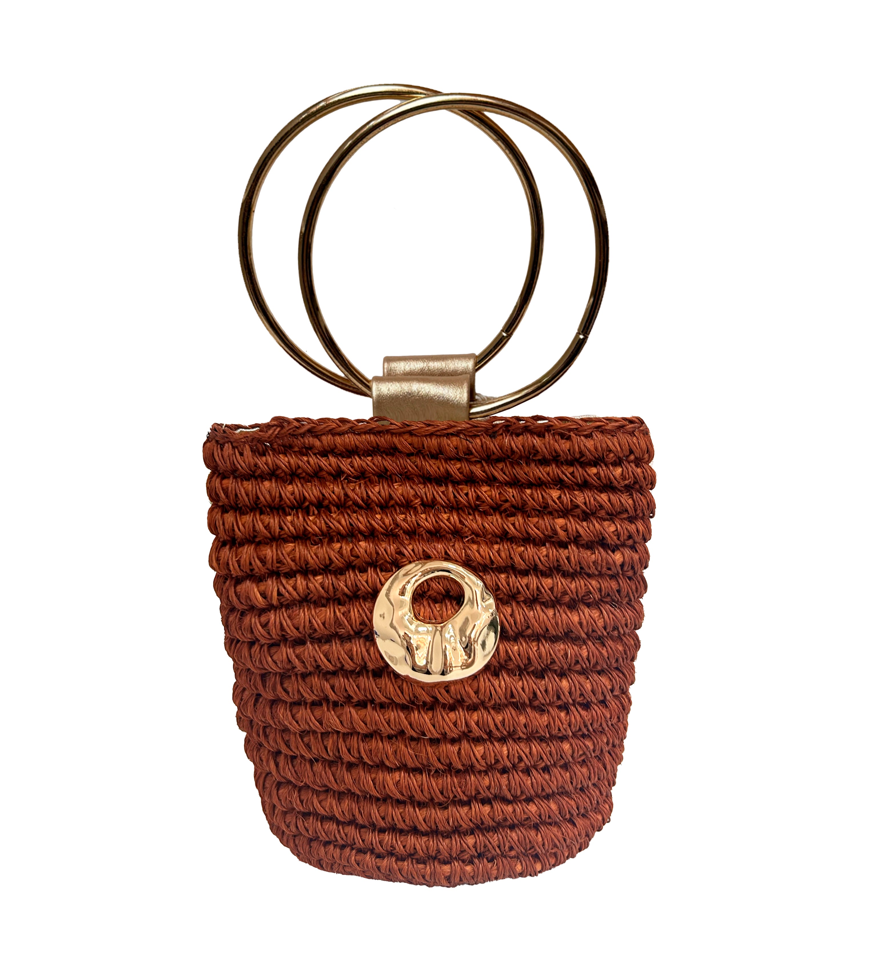 Un bolso tipo bucket tejido en fibra natural color terracota y asas metálicas doradas. Su textura artesanal y su detalle central metálico lo hacen perfecto para elevar cualquier look de día o de noche. Ligero, cómodo y con mucho estilo.