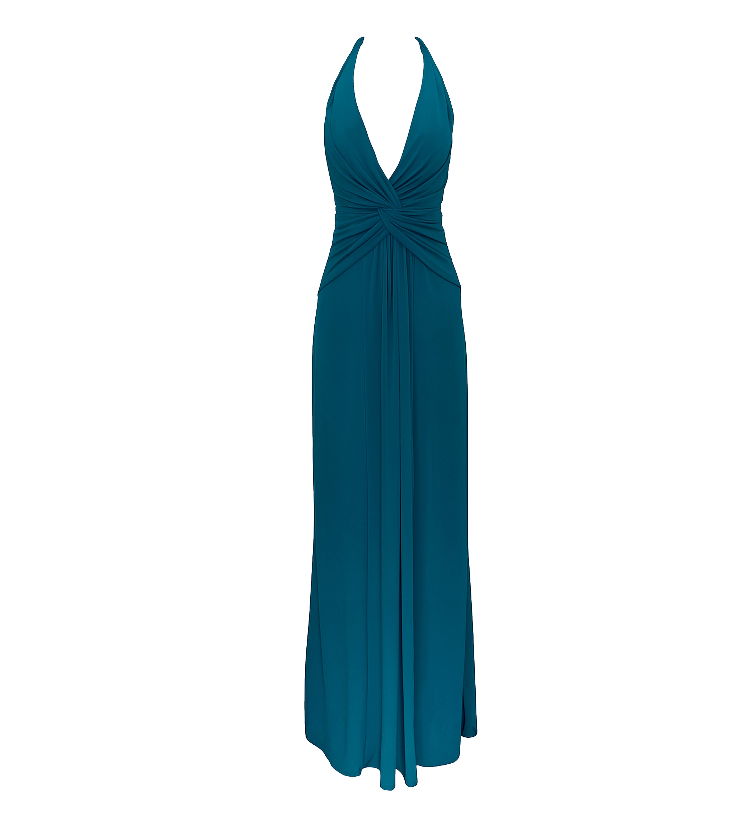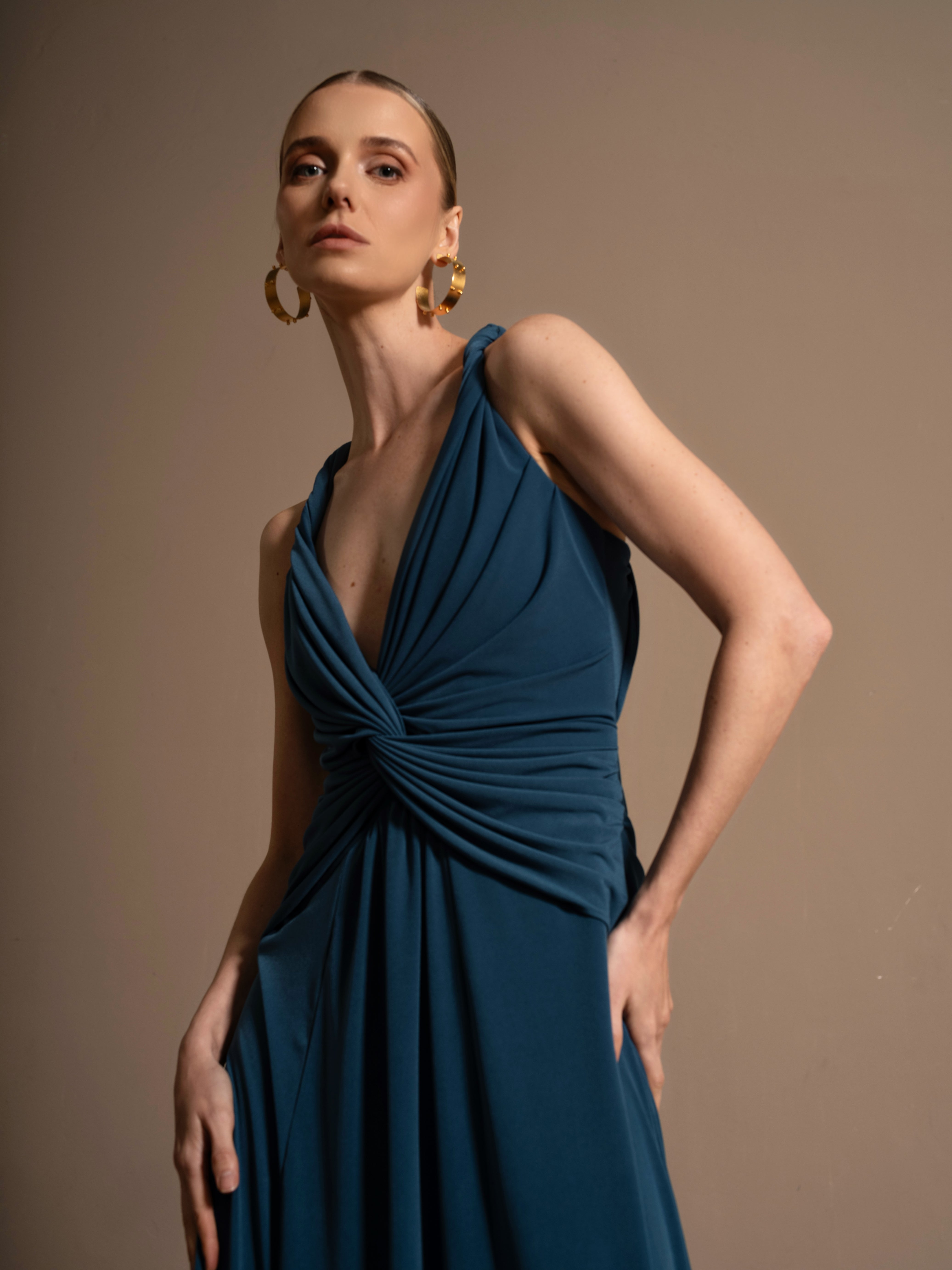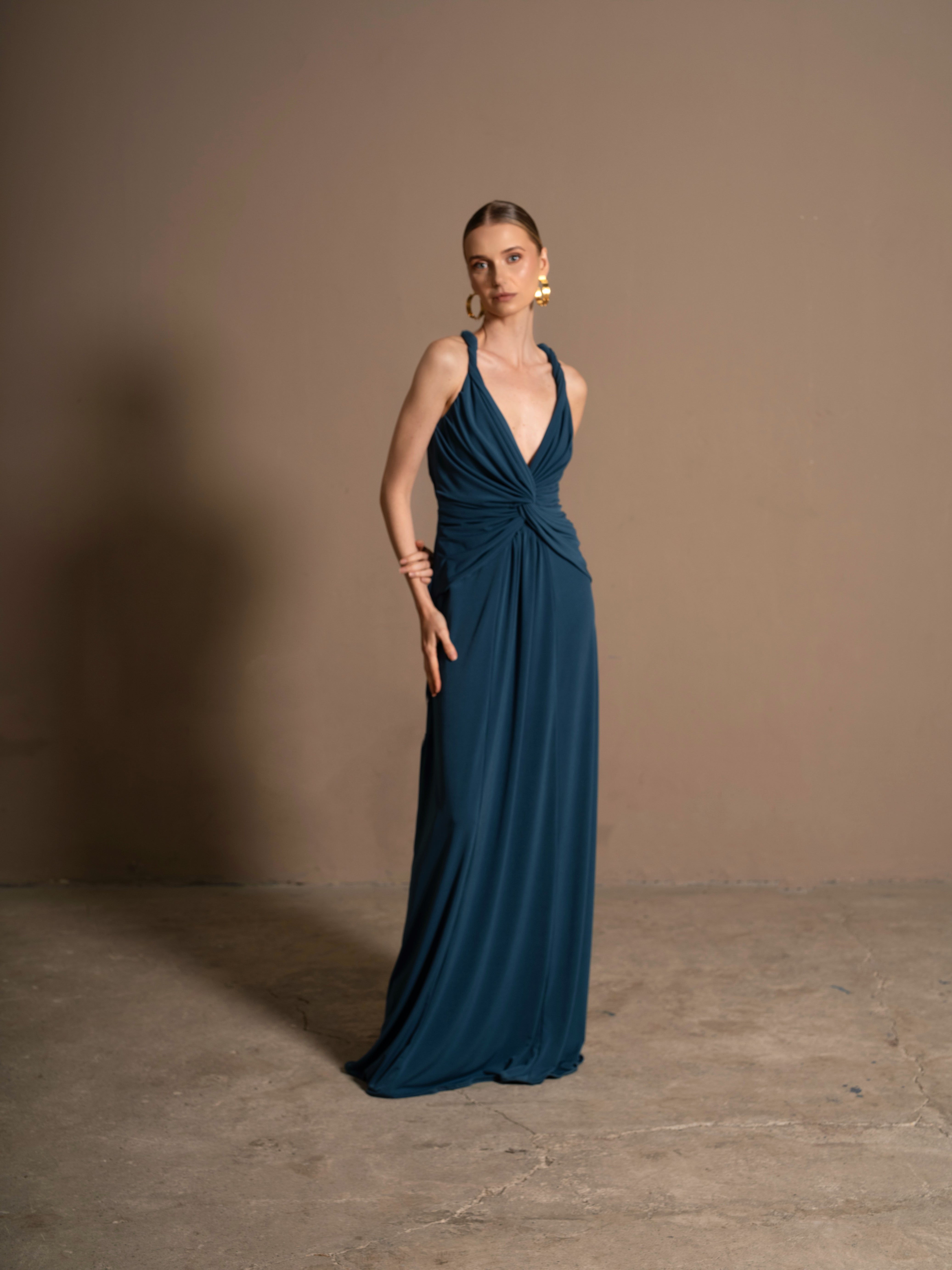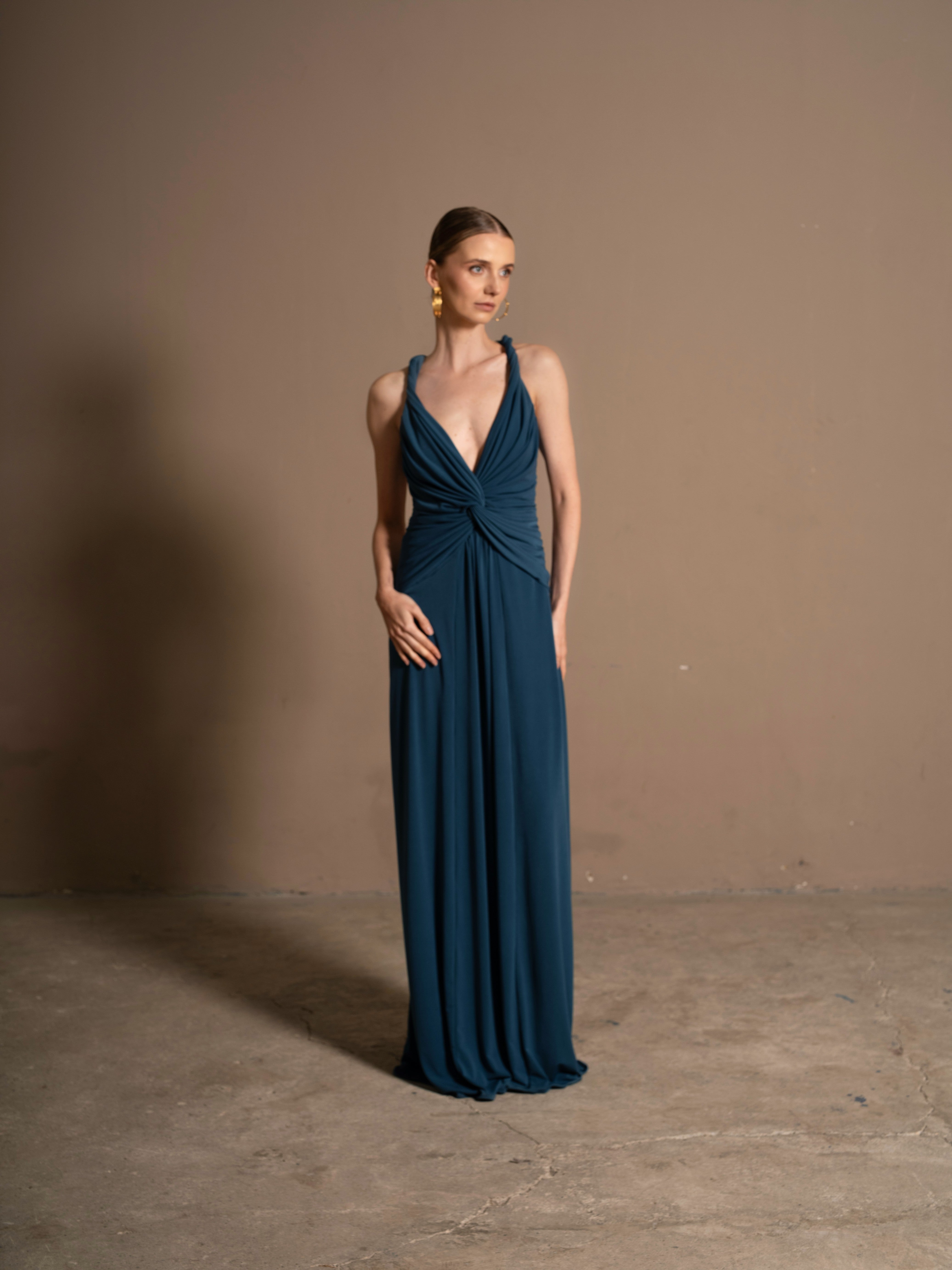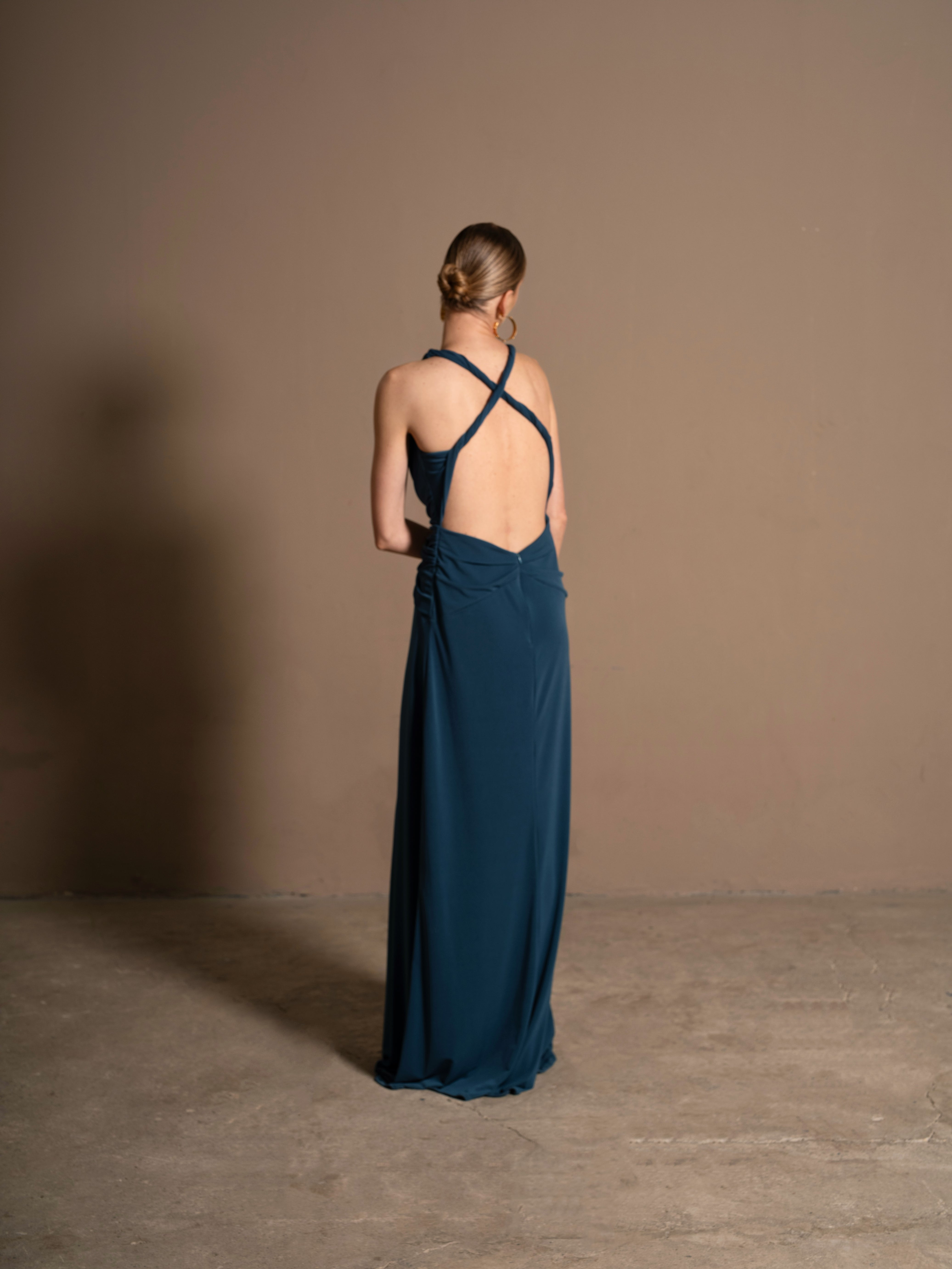 Nuestro vestido Mediterránea destaca por su silueta elegante y contemporánea, en un vibrante azul petróleo que realza la piel y transmite fuerza. Su diseño incluye un escote en V que confluye con un drapeado en la cintura, que aporta un toque moderno y sutilmente sensual. La falda ceñida y ligera alarga la figura y aporta un toque de fluidez. La espalda es descubierta con tirantes trenzados en forma de X.